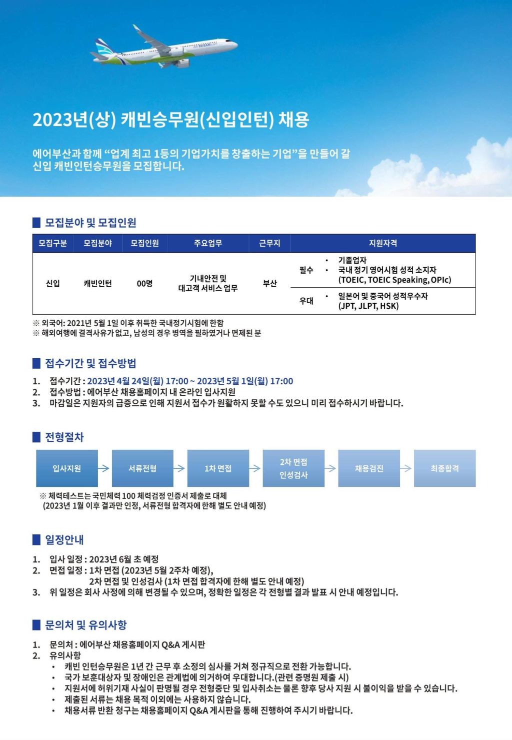 ※외국어 : 2021년 5월 1일 이후 응시하는 국내정기시험에 한함 접수시간 : 2023년 4월 24일(월) 17:00 ~ 2023년 5월 1일(월) 17:002 지원방법 : 에어부산 채용 홈페이지 온라인 지원 3. 신청 폭주로 원활한 접수가 어려울 수 있으니 사전 신청 부탁드립니다.