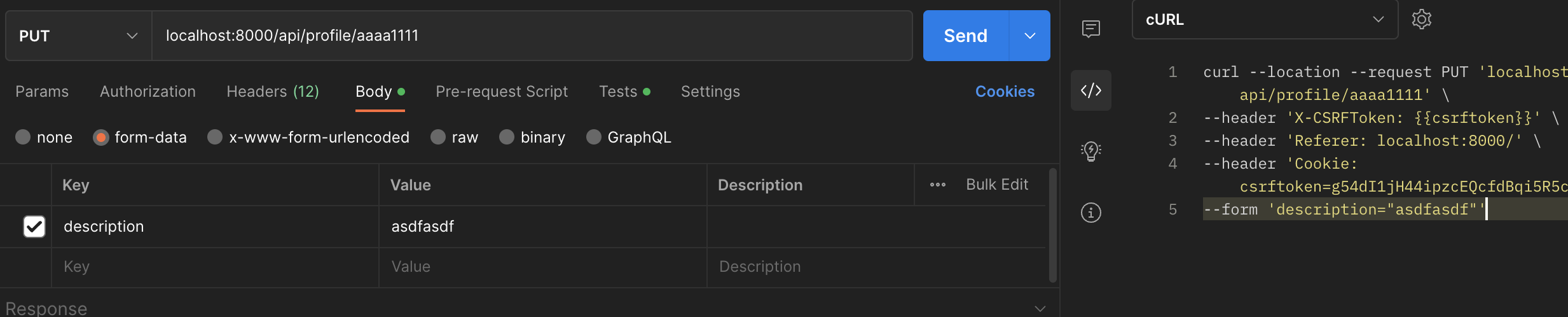 Django에서 PUT을 사용할 수 없다고 생각했지만 사실이 아닙니다. HTML입니다. 양식 태그는 GET 및 POST만 지원합니다.그렇기 때문에 앞에서부터 form 태그로 데이터를 보내든 Postman으로 요청 본문으로 데이터를 보내든 데이터가 제대로 전송되지 않습니다. 사실 form-data 형태로 보내지고 요청 내용을 열어보면 그 어디에도 데이터가 없습니다.